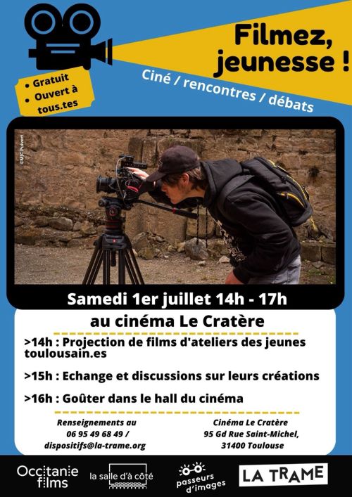 Dans le cadre du dispositif La Salle d’à côté piloté par Occitanie films, La Trame accueille en stage Lucas Renon qui travaille actuellement sur la mise en œuvre des séances de cinéma «Filmez, jeunesse !» pour mettre en valeur les réalisations audiovisuelles des jeunes de la région Occitanie, qu’elles aient été réalisées lors d’ateliers ou de leurs propres initiatives. Il est encadré dans ce stage par Mathilde Nodenot, en charge du suivi des dispositifs d’éducation à l’image de La Trame. Prévues pour les mois de juin et juillet, ces séances offriront aux jeunes l’opportunité de se rencontrer dans une salle de cinéma, d’échanger sur leurs créations, leurs pratiques audiovisuelles et leur passion pour le cinéma.