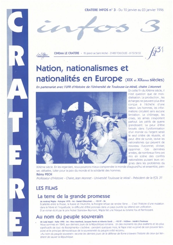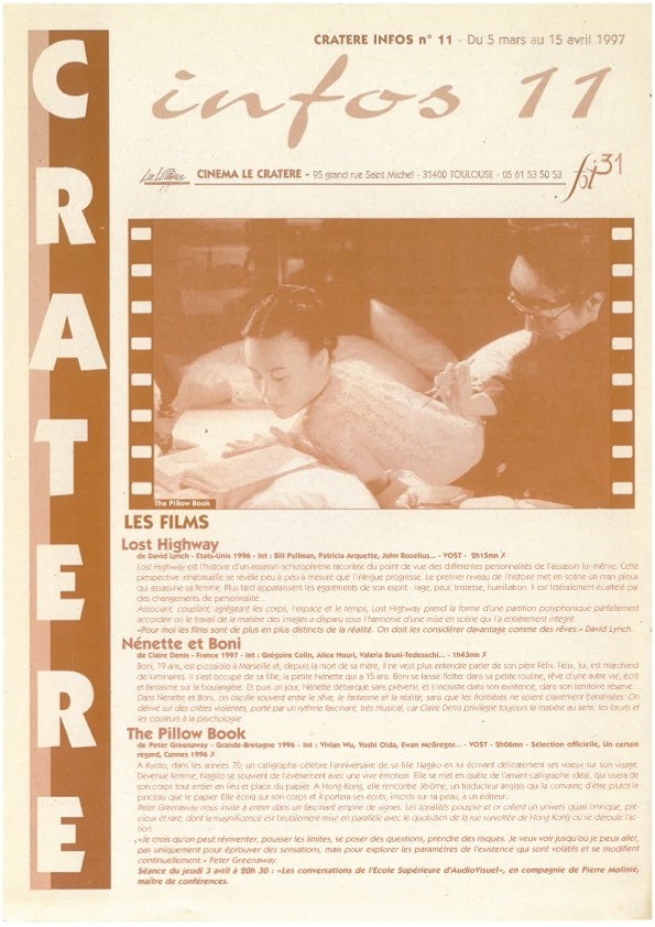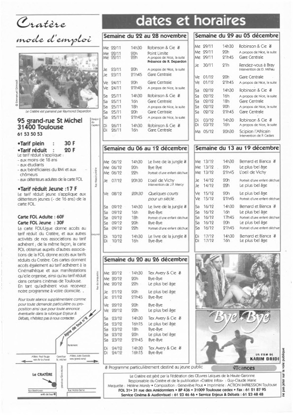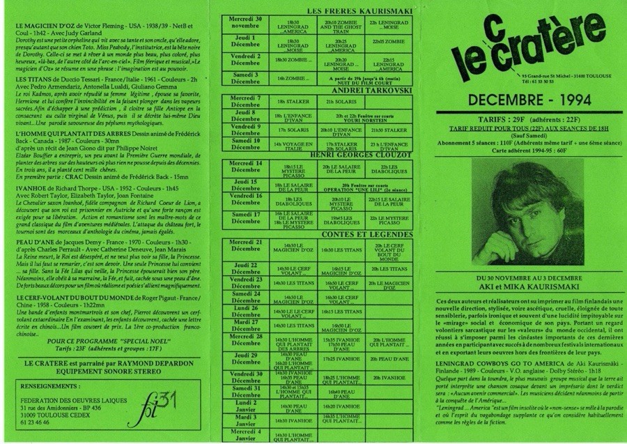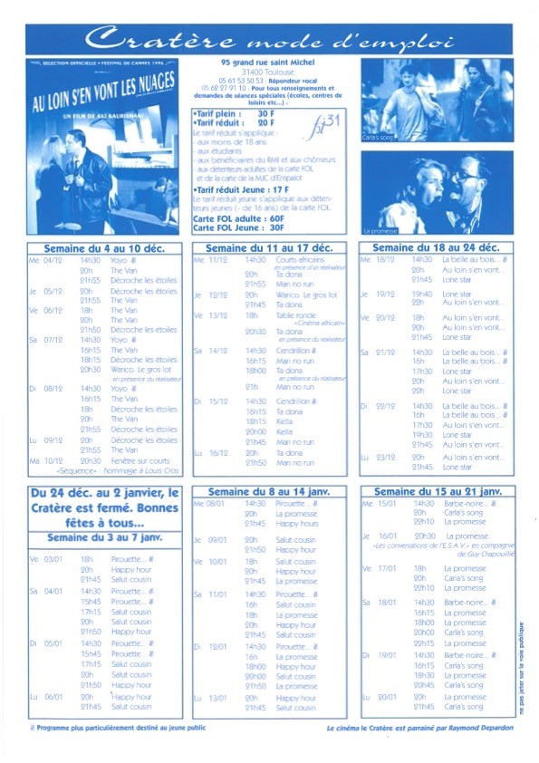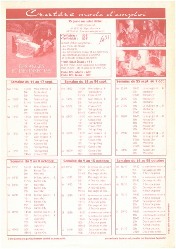 En 1994 : le Cratère devient une salle homologuée et rejoint la liste des salles de cinéma de Toulouse avec le label « Salle d’ Art et d’ Essai », elle est parrainée par Raymond Depardon.