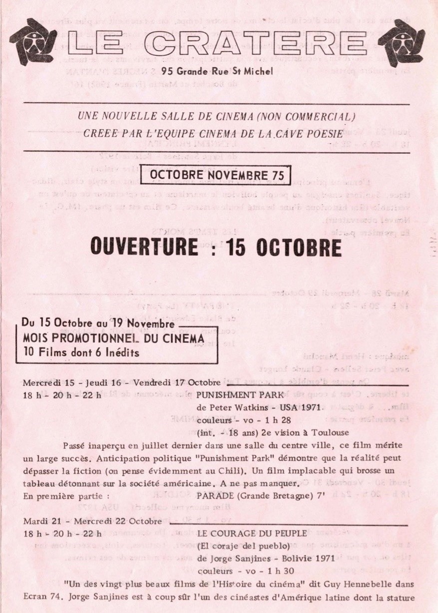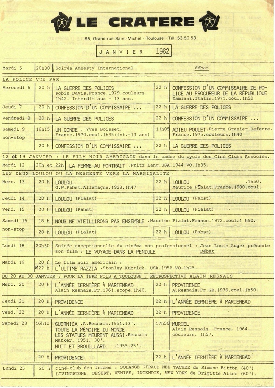 En 1975, c’est un ciné-club pilote, Le Cratère (Grande Rue St Michel) qui prend le relais. Cette petite salle « invente » les nuits du Cinéma , un « Ciné Jeune Public » régulier, accueille le Ciné-Club des Femmes et d’autres associations comme le CIES, le Groupe de Libération Homosexuelle etc, a toujours diffusé des courts-métrages, a fait découvrir des inédits aujourd’hui célèbres comme « The Party » de Blake Edwards, « Banana Split » de Busby Berkekey ou « Un Jour, un Chat » de Jasny ou encore « Le Grand Inquisiteur » de Michael Reeves ... entre autres.