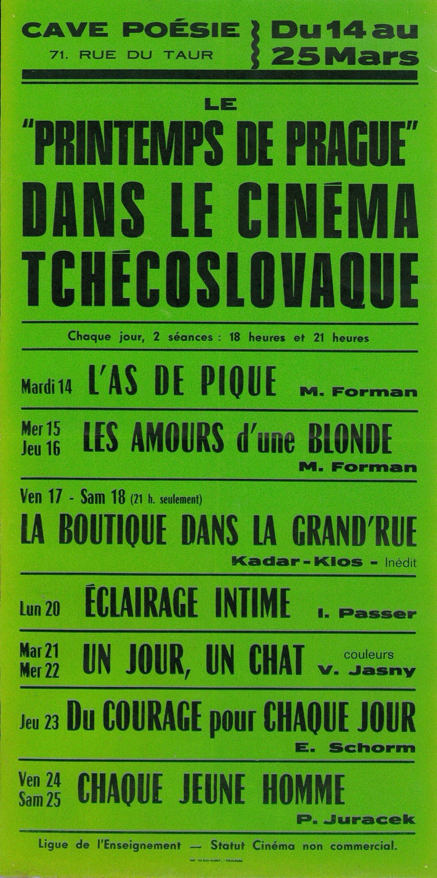 Dans les années 70, on comptait 160 ciné-clubs dans le département de la Haute-Garonne, dont 80 à Toulouse et une quinzaine en milieu universitaire. En 1969, gérée par la Ligue 31 (à l’époque Fédération des Oeuvres Laïques de la Haute-Garonne) René Gouzenne crée la Cave-Poésie, avec en alternance théâtre et cinéma.